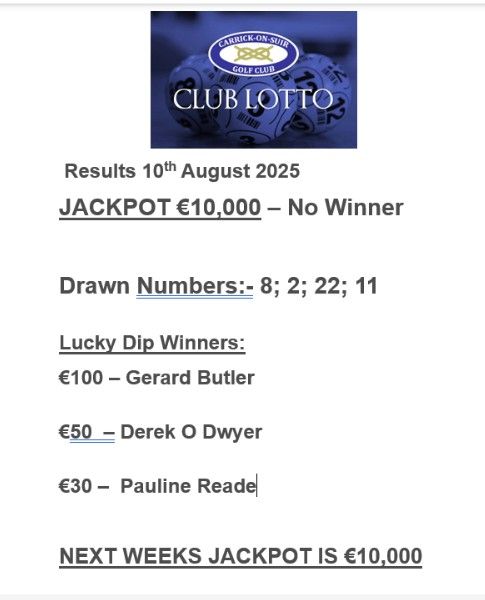 View Larger Image Carrick on Suir Golf Club Lotto Results 10th August 2025 Carrick Golf2025-08-10T14:20:03+01:00August 10th, 2025|
