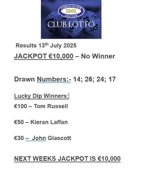 View Larger Image Carrick on Suir Golf Club Lotto Results 13th July 2025 https://carrickonsuirgolfclub.clubforce.com/products/lotto/carrick-on-suir-golf-club-lotto Carrick Golf2025-07-13T13:40:42+01:00July 13th, 2025|