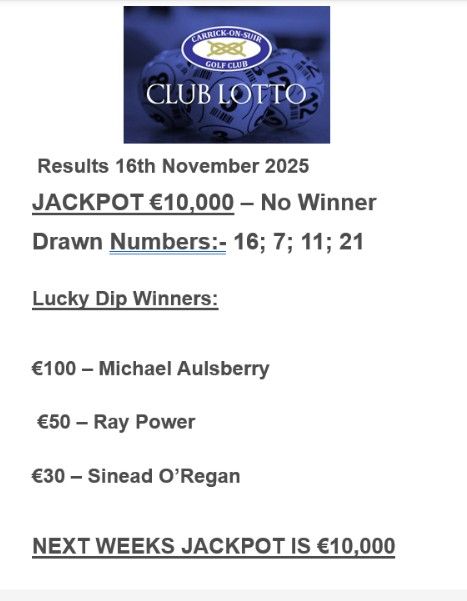 View Larger Image Carrick on Suir Golf Club Lotto Results 16th November 2025 Carrick Golf2025-11-16T14:39:38+00:00November 16th, 2025|
