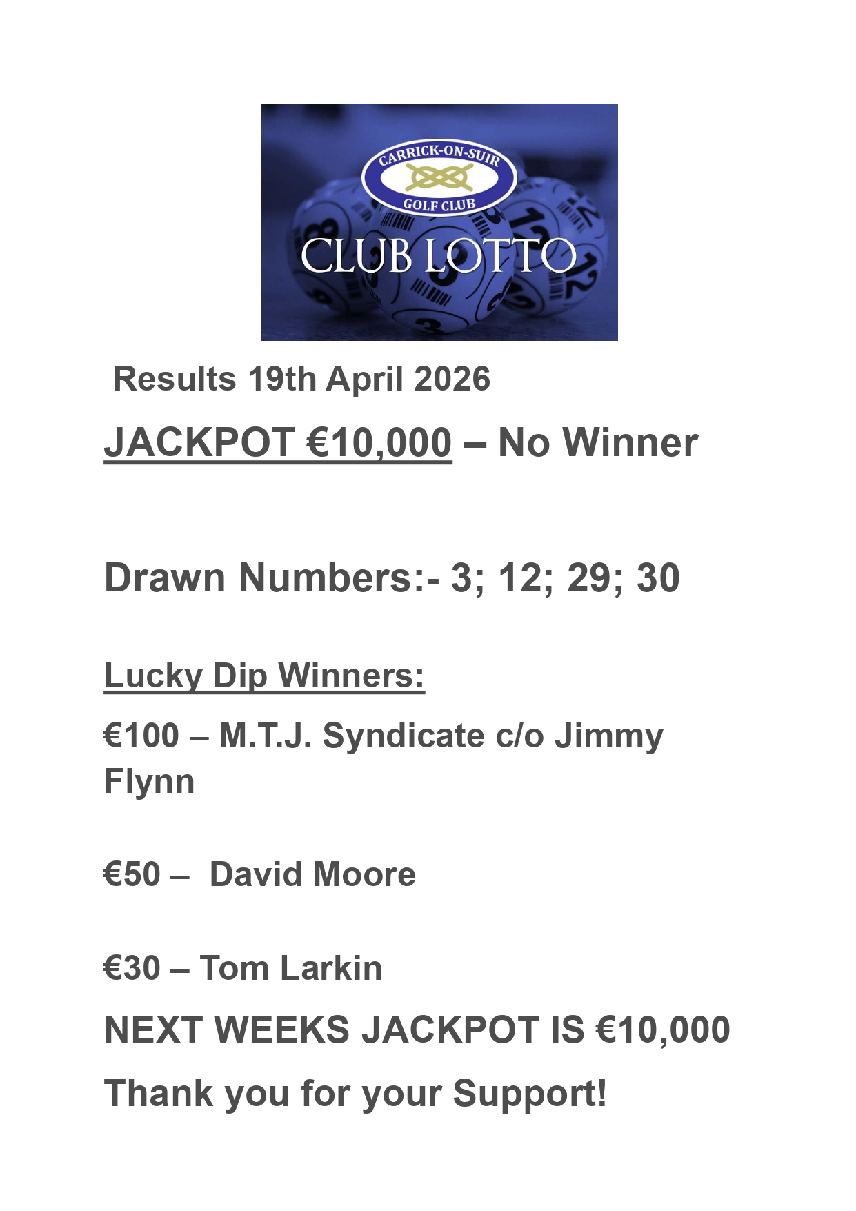 • Carrick on Suir Golf Club Lotto Results 19th April 2026