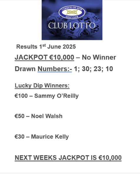 View Larger Image Carrick on Suir Golf Club Lotto Results 1st June 2025 Carrick Golf2025-06-01T16:45:44+01:00June 1st, 2025|
