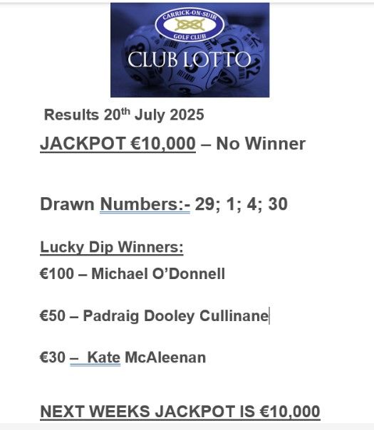 View Larger Image Carrick on Suir Golf Club Lotto Results 20th July 2025 Carrick Golf2025-07-20T13:23:18+01:00July 20th, 2025|