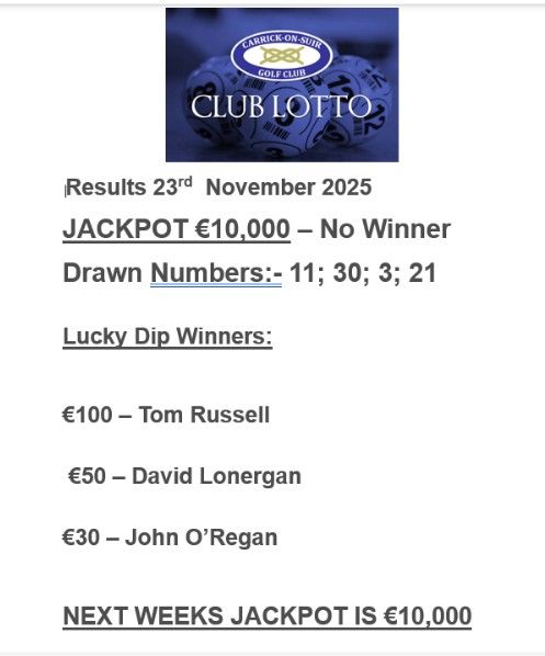 View Larger Image Carrick on Suir Golf Club Lotto Results 23rd November 2025 Carrick Golf2025-11-23T13:54:59+00:00November 23rd, 2025|