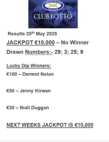 View Larger Image Carrick on Suir Golf Club Lotto Results 25th May 2025 Carrick Golf2025-05-25T16:04:27+01:00May 25th, 2025|