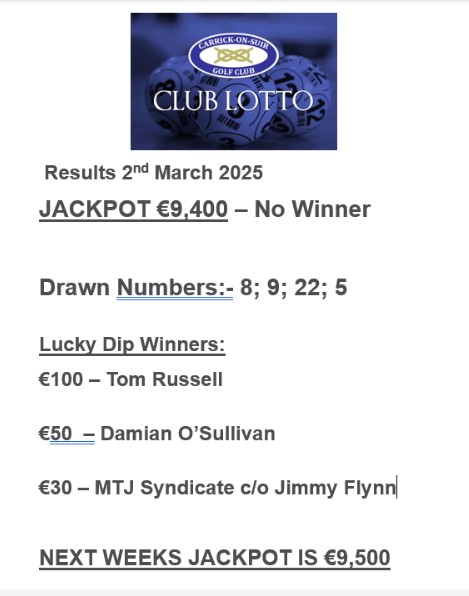 View Larger Image Carrick on Suir Golf Club Lotto Results 2nd March 2025 Carrick Golf2025-03-02T13:52:08+00:00March 2nd, 2025|