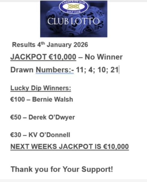 View Larger Image Carrick on Suir Golf Club Lotto Results 4th January 2026 Carrick Golf2026-01-04T13:55:58+00:00January 4th, 2026|