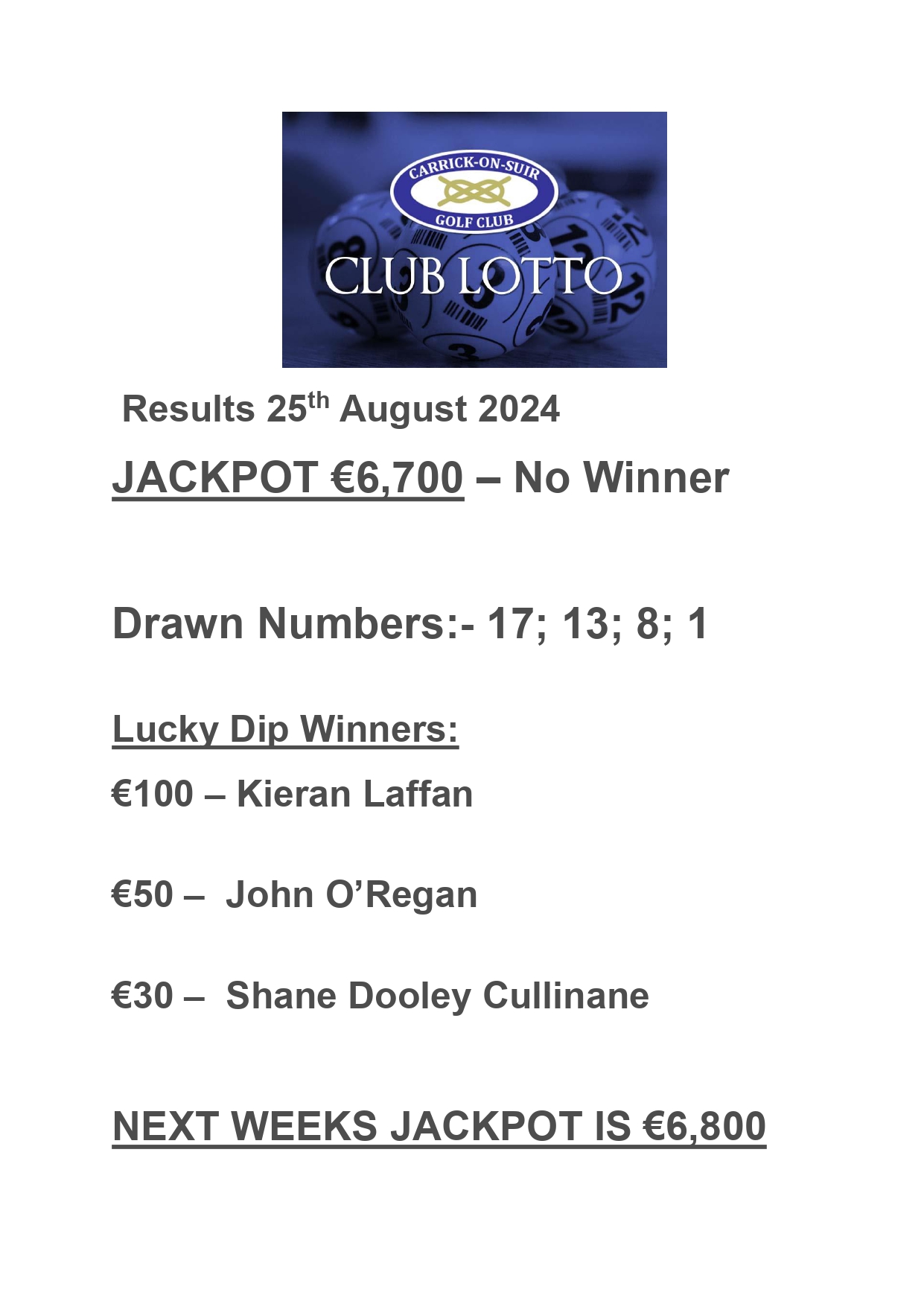 View Larger Image Club Lotto Results 25th August 2024 Carrick Golf2024-08-26T11:49:31+01:00August 26th, 2024|
