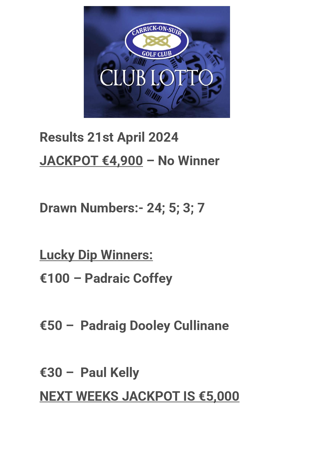View Larger Image Club Lotto Results – April 21st 2024 Carrick Golf2024-04-23T11:20:07+01:00April 23rd, 2024|
