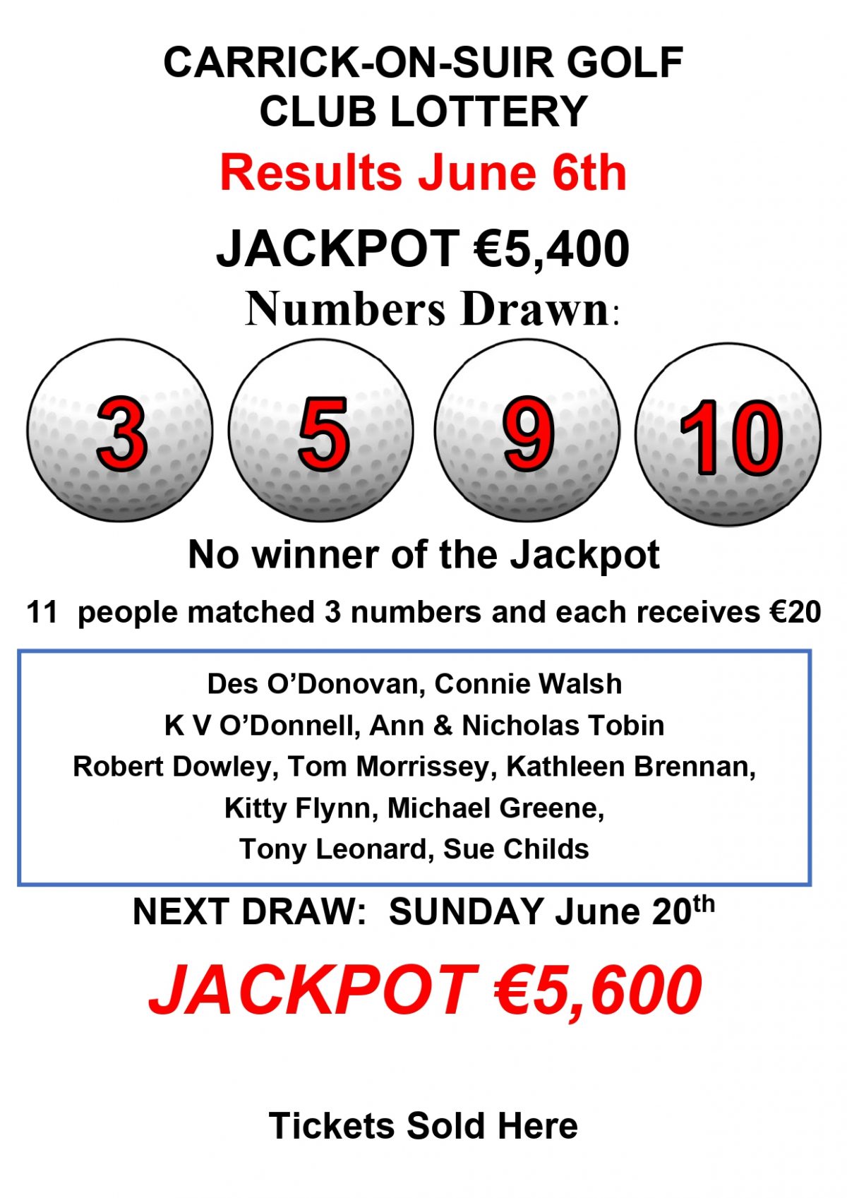 Club Lotto Results – June 6th 2021