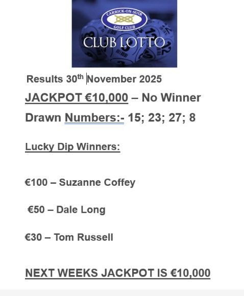 View Larger Image Carrick on Suir Golf Club Lotto Results 30th November 2025 Carrick Golf2025-11-30T15:14:39+00:00November 30th, 2025|